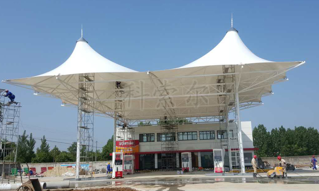 工程地點:棗陽加油站工程面積:1500平方米工程結構:張拉式體育場膜結構看臺工程鋼材:Q235材質規格的無縫焊管,使用年限50年工程膜材:德國進口杜肯B18059PTFE環保膜材質保書15年