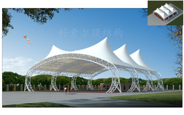膜結構又稱為索膜結構,它是一種建筑與結構完美結合的結構體系。它是用高強度柔性薄膜材料與支撐體系相結合形成具有一定剛度的穩定曲面,能承受一定外荷載的空間結構形式。其造型自由輕巧、阻燃、制作簡易、安裝快捷、節能、易于、使用安全等優點,因而使它在世界各地受到廣泛應用。這種結構形式特別適用于大型體育場館、人口廊道、小品、公眾休閑娛樂廣場、展覽會場、購物中心等領域。